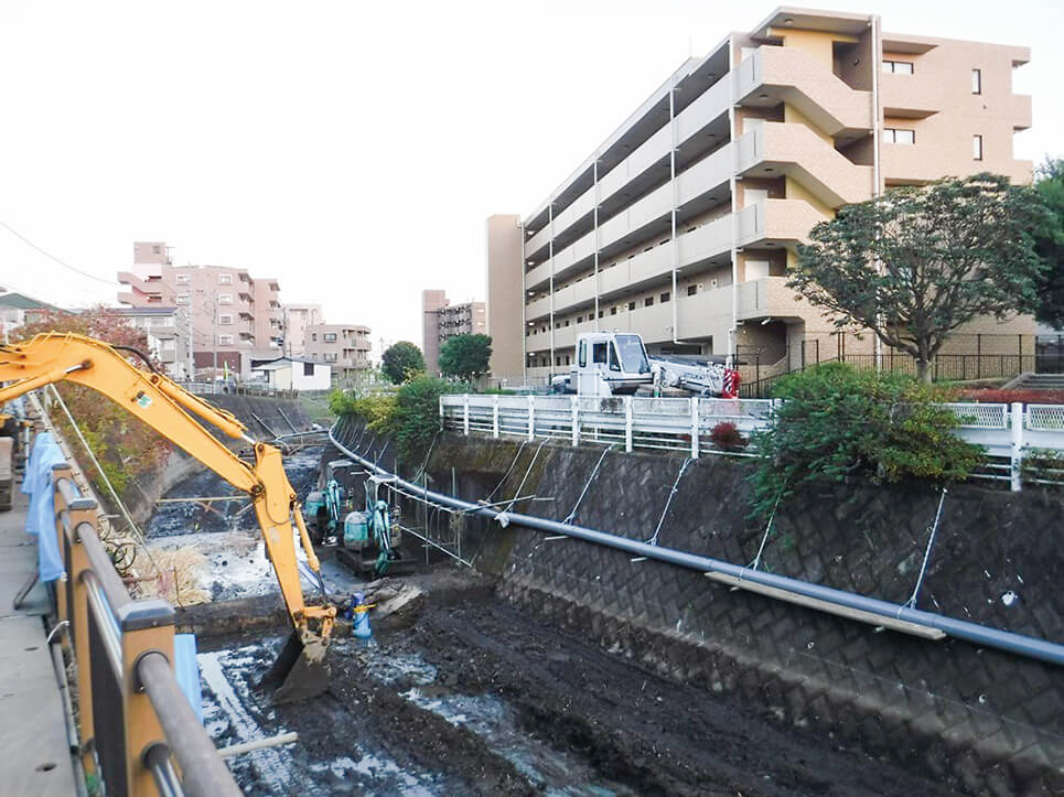 横浜市では、近年の突発的な豪雨などに備えた河川づくりを進めています。また、日ごろから航空写真やAI技術を活用した、洪水の原因となる土砂堆積の把握や除去など、安全な河川の維持管理に役立てています。