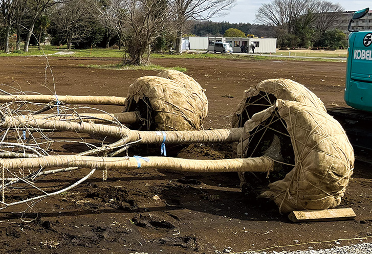 移植対象の樹木を丁寧に掘り上げ、根鉢(根と土の塊)を大切に包み移植先に運びます。