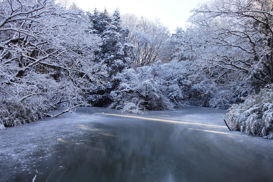 雪化粧した冬のため池の姿をご覧ください。雪に覆われた木々が、凍った水面にそっと寄り添っています。白銀の景色が訪れる人の心にやさしく語りかけます。