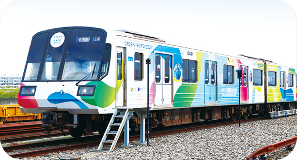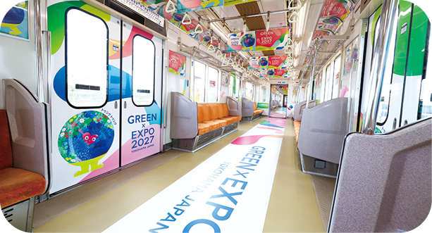 ラッピングされた市営地下鉄ブルーラインとグリーンラインの車両がEXPO閉幕まで運行します。EXPOに彩られた鮮やかな電車に乗って、一足早くワクワクを感じてみよう!