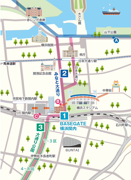 JR関内駅から、横浜橋通商店街のある市営地下鉄阪東橋駅付近まで約1.2km続く「大通り公園」を全面リニューアル中です。