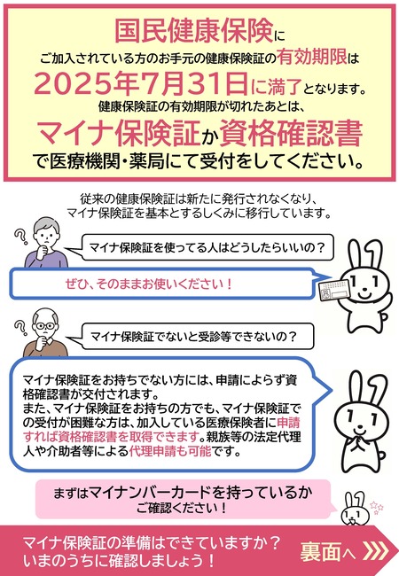 マイナ保険証の利用登録の有無により、「資格情報のお知らせ」もしくは「資格確認書」をお渡しします。
