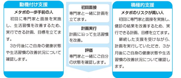 特定保健指導は、健診結果に応じてご本人が自らの健康状態を理解し、生活習慣改善のための自主的な取組を継続的に行うことができるよう、専門家(医師・保健師・管理栄養士等)による生活習慣改善等のサポートを行います。