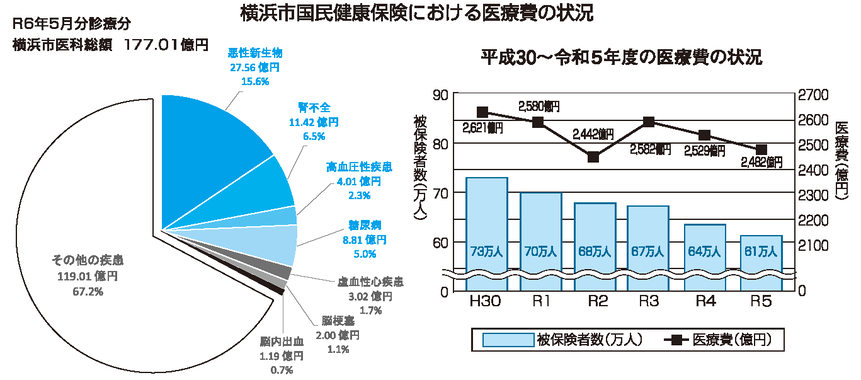 疾病全体に占める虚血性心疾患、脳血管疾患、糖尿病などの生活習慣病の割合は年々増加しています。現在、横浜市国民健康保険における医科総医療費において生活習慣病(悪性新生物を除く)の占める割合は約2割となっています。