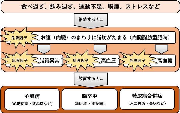 内臓脂肪の蓄積した「内臓脂肪型肥満」が、生活習慣病(高血圧、高脂血症、糖尿病など)の共通の原因であるとされています。この「内臓脂肪型肥満」に加えて、高血圧・高血糖・脂質異常などに関連する危険因子を複数あわせもち、生活習慣病が引き起こされる確率が高い状態をメタボリックシンドローム(内臓脂肪症候群)と呼びます。