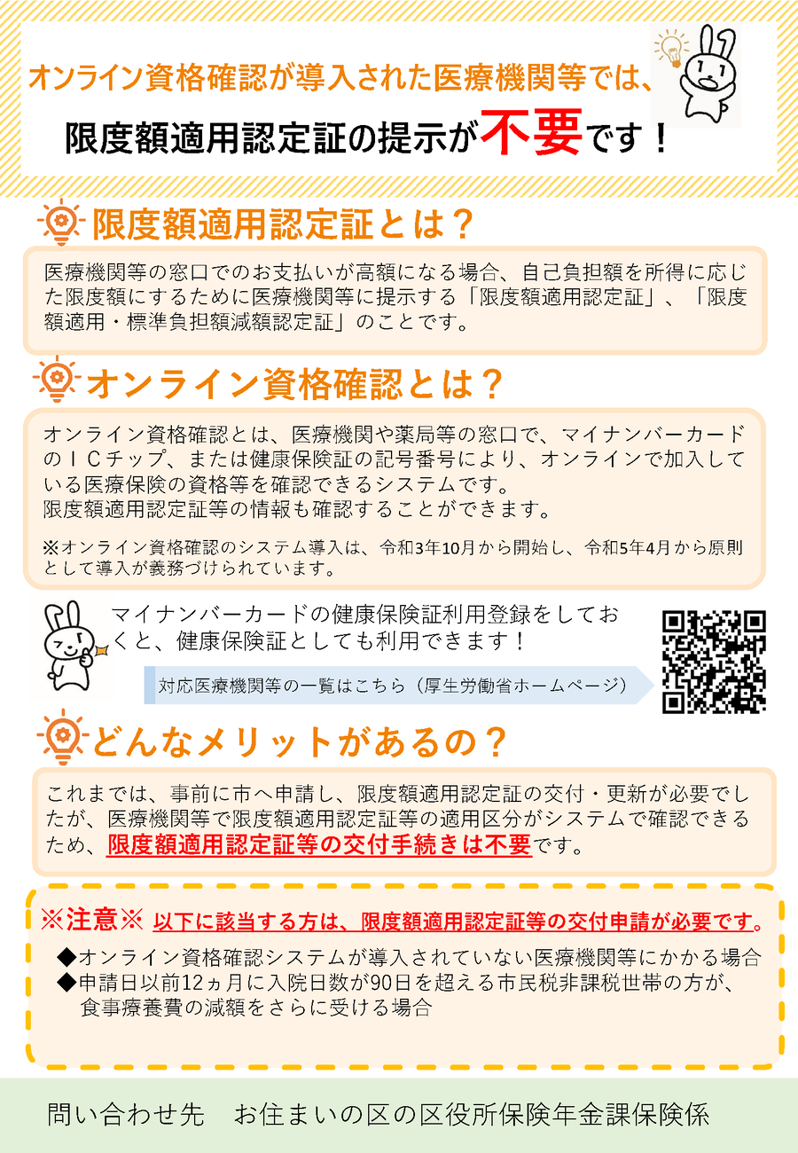 医療機関等でのオンライン資格確認システムの導入に伴い、システムにて限度額適用区分の確認ができるため、限度額適用認定証(非課税世帯の方は、「限度額適用・標準負担額減額認定証」)の提示は不要になります。