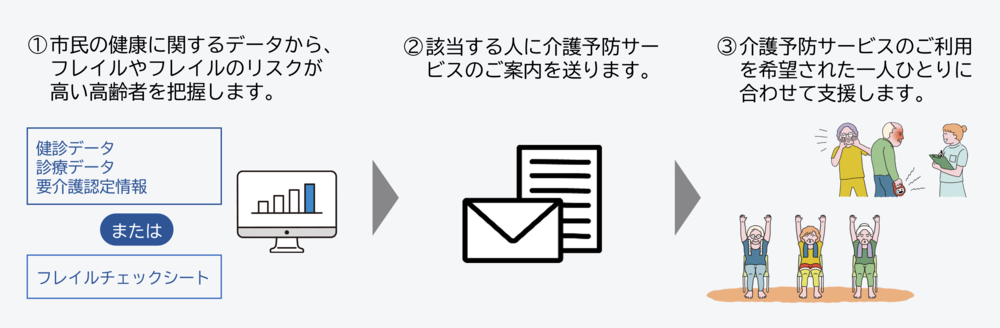 市民の健康に関するデータ(健診データ、医療データ、要介護認定情報等)を活用し、フレイル等の高齢者を把握し、身体機能や栄養状態、口の機能の低下が心配される方に対して一人ひとりの健康課題に合わせた介護予防サービスを提供します。
