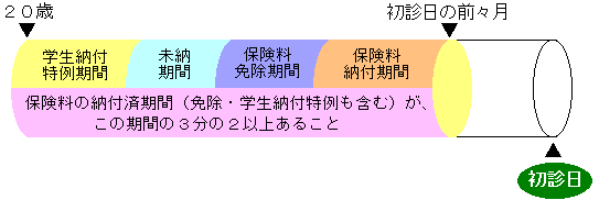 または、国民年金の被保険者であった60歳以上65歳未満の方で、日本国内に住所を有していること。 - 初診日の属する月の前々月までの被保険者期間に3分の2以上の保険料を納めた期間(保険料免除期間等も含む)があること。