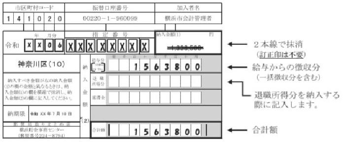 横浜市の納入書は特別徴収義務者様で訂正してお使いいただけますので、新しい納入書はお送りしていません。