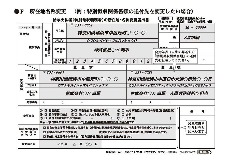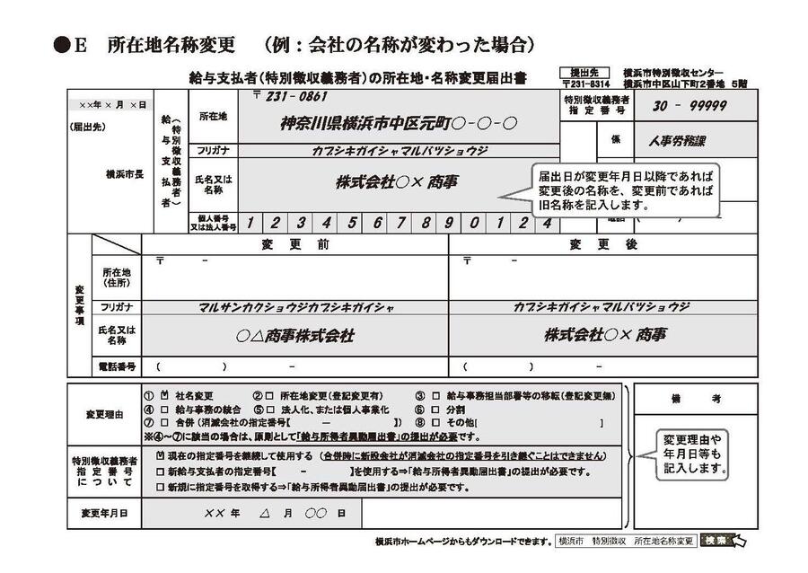 給与支払者(事業主)の所在地や名称の変更がある場合や、税額通知書等の書類送付先を変更する必要がある場合は、「給与支払者(特別徴収義務者)の所在地・名称変更届出書」を速やかに横浜市特別徴収センターに提出してください。