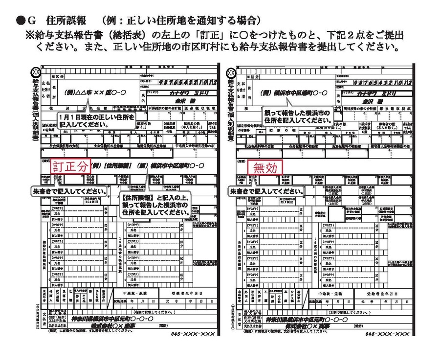 住所欄に「1月1日現在の正しい住所」、摘要欄に朱書きで「訂正分 【住所誤報】(誤)誤って記載した横浜市の住所」を記載。