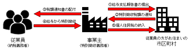 個人住民税の特別徴収とは、所得税の源泉徴収と同じように、事業者(給与支払者)が従業員(納税義務者)の代わりに給与から個人住民税を引き去り、市区町村へ納入していただく制度です。
