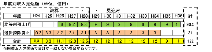 平成24年度の条例改正に伴う税収は、平年度ベースで単年度において、均等割の税率引き上げが約9億円、退職所得10%税額控除廃止が約3億円、合計約12億円と見込んでおり、10年間で約120億円となると見込んでいます。この増収分は、国において特別に措置された地方債(緊急防災・減災事業債)が充当可能な事業の償還財源などに活用していきます。
