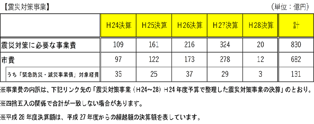 24年度から28年度までの震災対策事業費は830億円となりました。