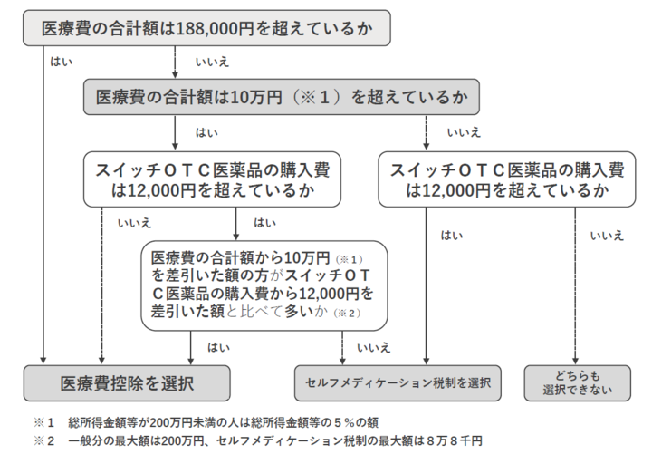 そのため、セルフメディケーション税制の適用を受けることを選択した人は医療費控除(一般分)の適用を受けることができず、医療費控除(一般分)の適用を受けることを選択した人は、セルフメディケーション税制の適用を受けることはできません。