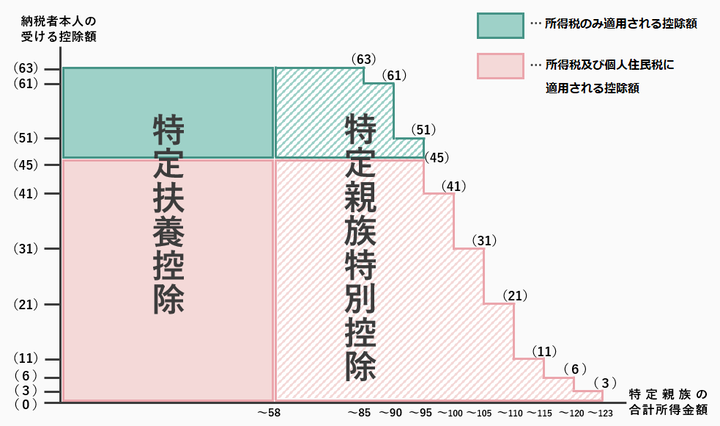 従来より、納税義務者に、19歳以上23歳未満である特定控除対象扶養親族がいる場合、その納税義務者の前年の総所得金額等から所得税は63万円、住民税は45万円を控除することとされていましたが、令和7年1月1日から12月31日までの収入を基礎とする令和8年度の個人住民税から、合計所得金額が58万円を超える19歳から23歳未満の親族がいる場合においても、納税義務者が受けられる控除額が当該親族の合計所得金額に応じて逓減(徐々に減少していく)していく仕組みで新たに設けられます。