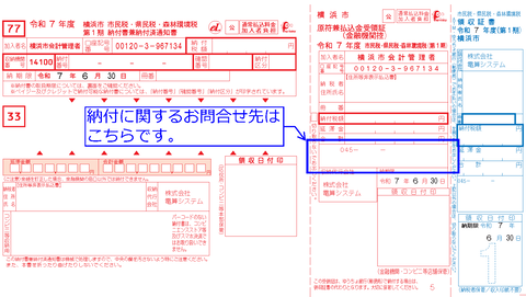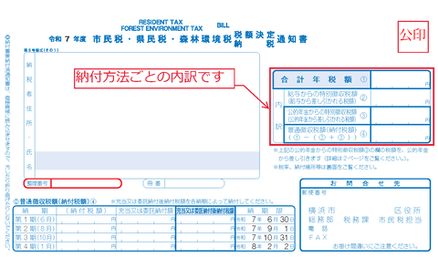 納税通知書の1枚目に納付方法ごとの金額を記載しております。
