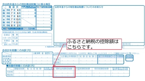納税通知書の税額控除の内訳欄に記載しています。ふるさと納税という名称ではなく、寄附金税額控除として記載されています。