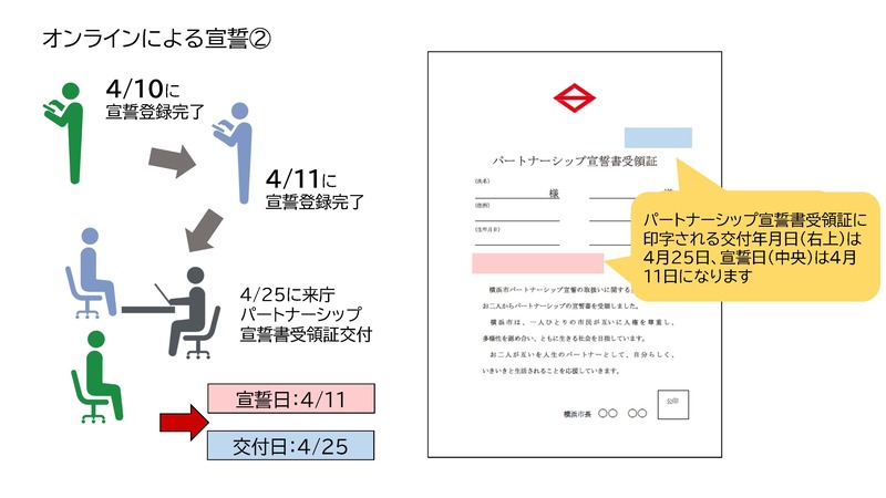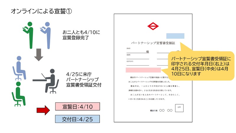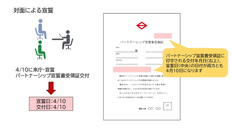 - 交付日になりましたら、お二人で横浜市庁舎にお越しください。 (所在地:中区本町6丁目50番地の10)「パートナーシップ宣誓書受領証」、「パートナーシップ宣誓書受領証明カード(ご希望の方のみ)」を交付します。