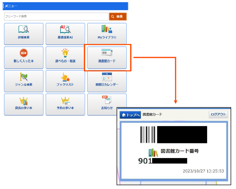 画面上にバーコードと利用者番号(図書館カード番号)、現在の時間が表示され、図書館窓口でカードと同じように利用できます。