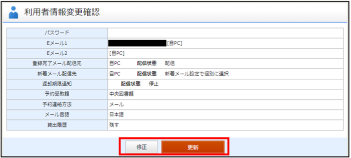 変更内容を確認し、誤りがなければ、〔更新〕を押してください。誤りがある場合は、〔修正〕を押すと、変更画面にもどります。