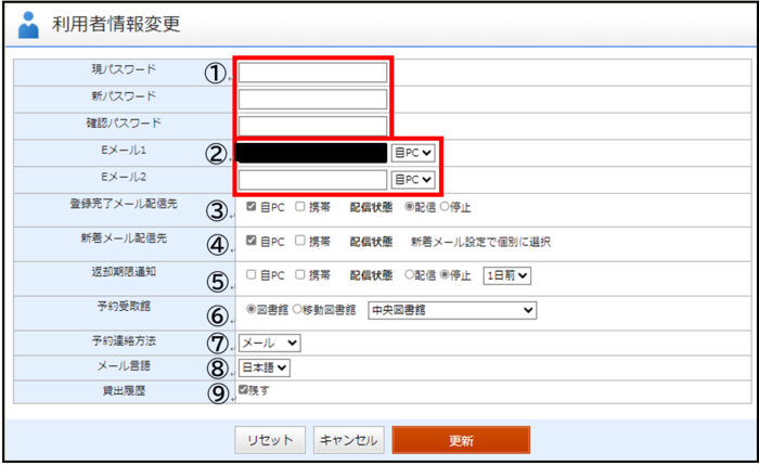 蔵書検索ページで、パスワードの変更やメールアドレスの登録・変更ができます。また、予約受取館や予約連絡方法、返却期限通知などをあらかじめ設定しておくことができます。