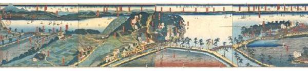 『東海道名所之内横浜風景』は、ほぼA4判(横位置)の大きさ8枚、横浜道の入り口である東海道芝生村(現:西区浅間町)から野毛の切り通しをこえ、吉田橋をわたり、居留地を経て本牧に至るまでを一望にした細密な鳥瞰図であり、『神名川横浜新開港図』(Yokohama's MemoryVol.1収録)とならぶ初期横浜浮世絵を代表する作品です。