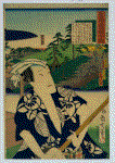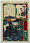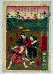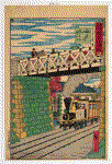 | 立祥(二代広重) 【東海道五拾三駅 五 程ケ谷 かたびら橋】 拡大図へ(60KB) | 国周・広重 【東海道一ト眼千両 程ケ谷 飴売千太郎】 慶応3年2月 拡大図へ(96KB) |