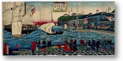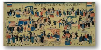 | 右:「欧邏巴洲之内 仏蘭西国 南京」一川芳員(外部サイト) 中:「魯西亜国ノ商館休日ニテ小児透引シ海岸ニ遊フ図」貞秀(外部サイト) 左:「亜墨利加人 蛮語和解」芳虎(外部サイト) | |||