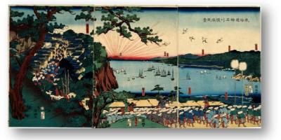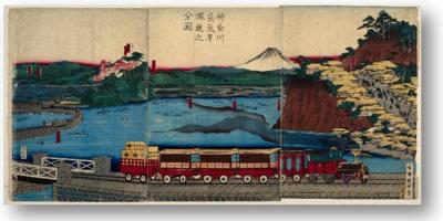 | ↑「東海道神名川横浜風景」二代国輝(外部サイト) | ↑「神奈川蒸気車鉄道之全図」二代国輝(外部サイト) | ||