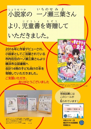 小説家・一ノ瀬三葉様より、新本の児童書計14冊が横浜市中央図書館へ寄贈されました。