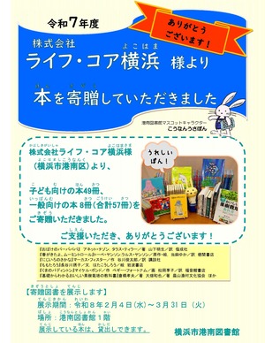 株式会社ライフ・コア横浜様より、児童書・一般書合わせて57冊を、港南図書館へご寄贈いただきました。