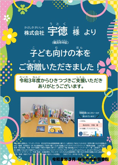 株式会社宇徳様より、児童書58冊を、中央図書館へご寄贈いただきました。