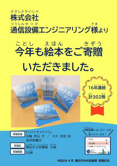 株式会社通信設備エンジニアリング様より、新品の児童書18冊を全館へご寄贈いただきました。