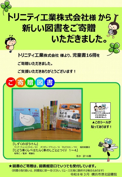 トリニティ工業株式会社様より、新品の児童書16冊を港北図書館へご寄贈いただきました。