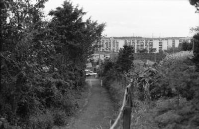 未舗装の小道は現・上白根長坂第三公園前の道。前方がバス停「上白根入口」方向。小道左側は低木が茂っている。奥の集合住宅の建物群は市営ひかりが丘団地5街区。