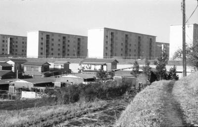 市営ひかりが丘団地6街区。手前右の未舗装の小道は後に拡幅整備された。