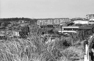 旧大池小学校、現四季の森小学校付近から西ひかりが丘団地19街区を望む。右手前の鉄筋コンクリートの建物は西山幼稚園。