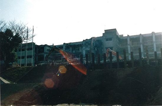 - 浦島丘中学校グラウンド側より旧校舎改築工事風景を眺める