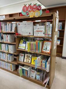 港北図書館1階児童書コーナーに「りんごの棚」を作りました(2025年6月)