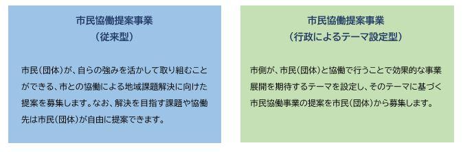 市民協働条例の施行に伴い、横浜市から協働事業の相手方を募集したり、市民等から市に対して市民協働事業を提案することができるようになっています。募集や提案を受けた市民協働事業が実現されるよう支援していくのがこの事業の取組です。
