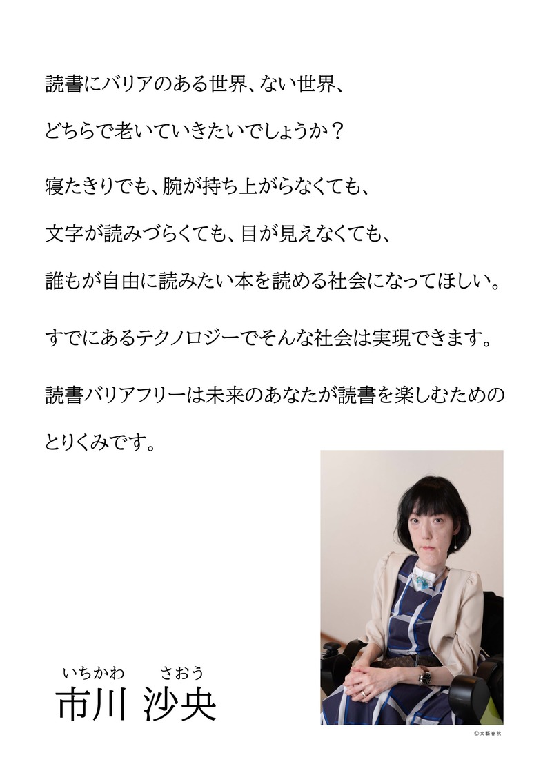 『ハンチバック』で第169回芥川賞を受賞された作家の市川沙央さんから、市民の皆様に向けて、読書バリアフリーに関するメッセージを寄せていただきました。