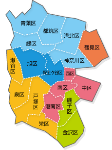(色分けは、横浜市に区制が施行された時の最初の区分けを表しています。)