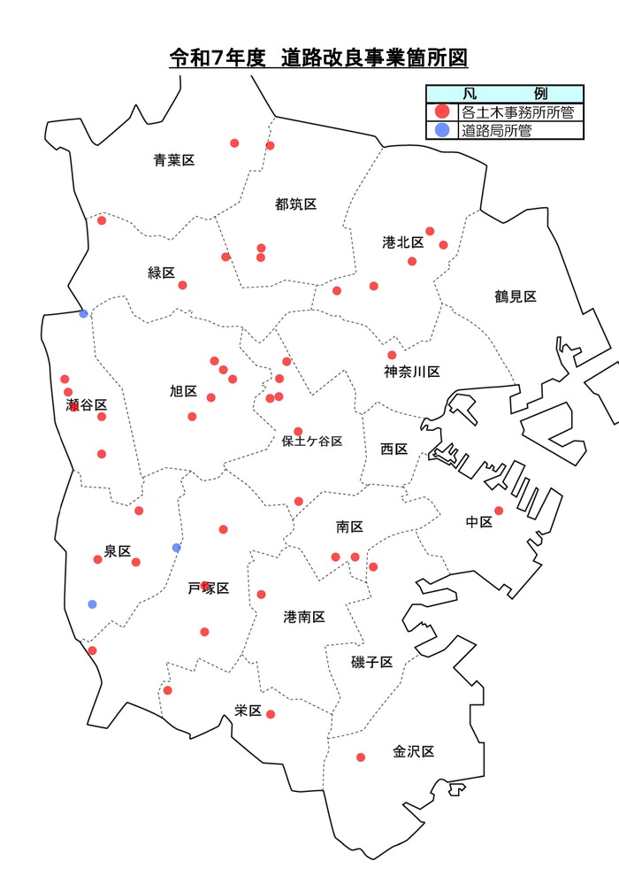 該当区をクリックすると各区の事業箇所図へ移動します。※鶴見・西区には、事業中の箇所はありません。