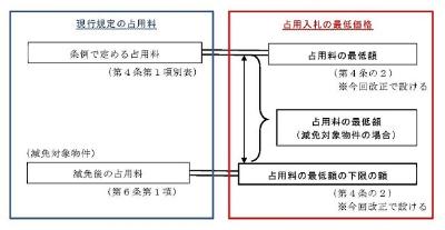 新たに第4条の2を設け「条例で定める占用料」を「占用料の最低額」とするとともに、減免対象物件については「減免後の占用料」を「占用料の最低額の下限の額」とします。