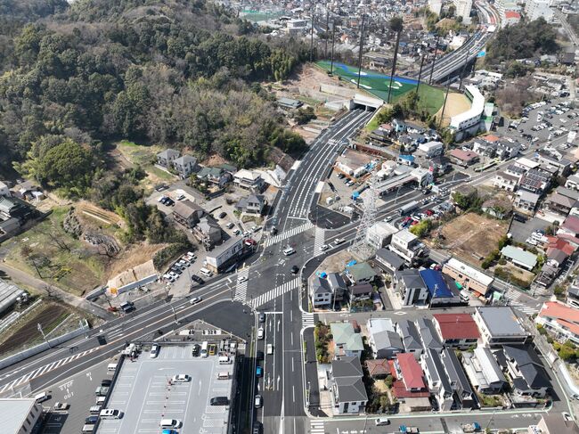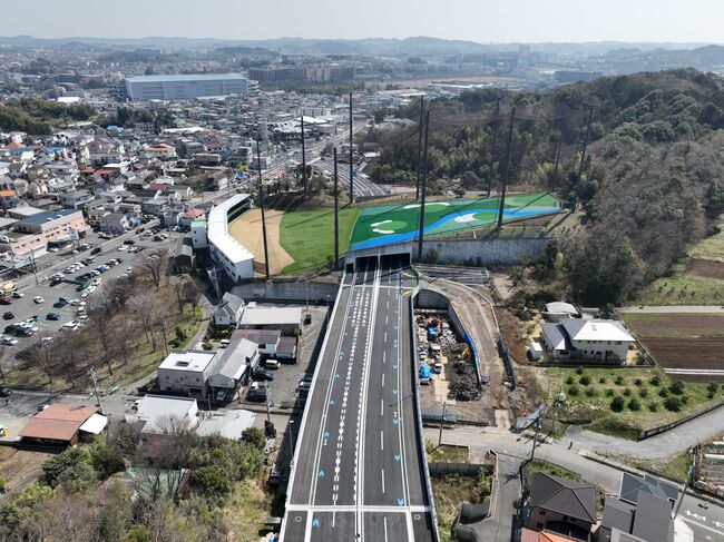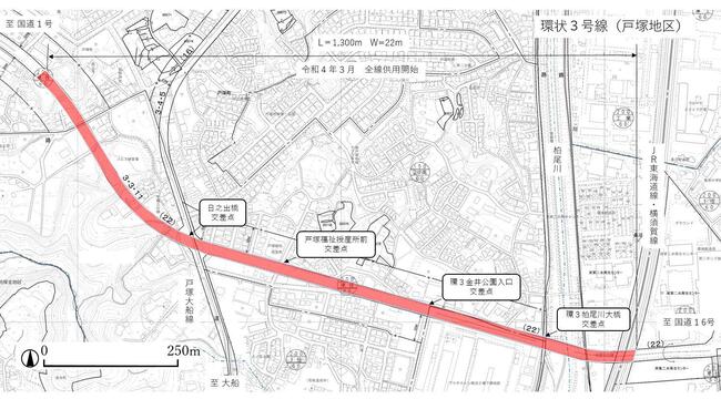 環状3号線(戸塚地区)は東隣の長沼地区から西側に向けて事業を進めています。平成16年3月に、栄区長沼町の環3長沼交差点からJR東海道線と柏尾川を高架で超える区間が完成しました。平成16年7月に日之出橋交差点までの850mが開通したのち、令和4年3月に残りの450mを含む本線約1,300mが開通しました。