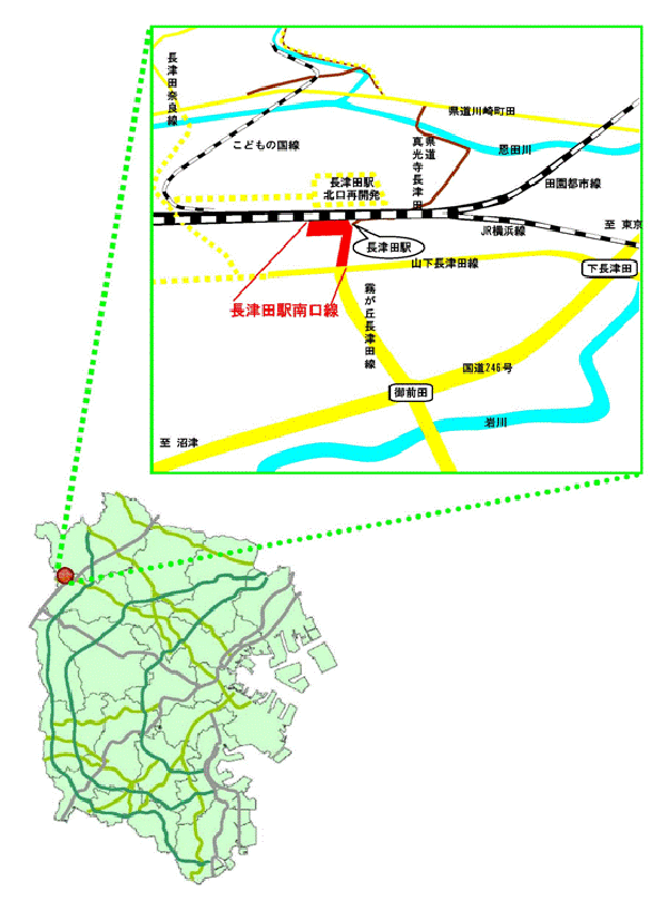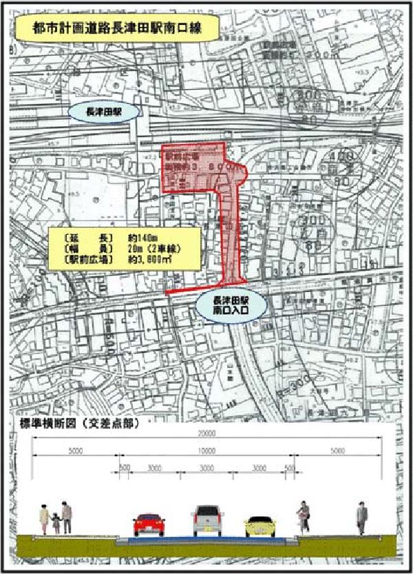 都市計画道路長津田駅南口線は、山下長津田線の長津田駅南口入口交差点から長津田駅南口に至る延長約140m、幅員20mの道路です。
