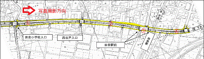 田奈地区は、田奈小学校入口交差点付近から田奈駅の先約100mまでの標準幅員22m、延長約650mの区間です。