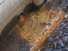 なお、自然現象として川が茶色くなることもあります。河川の護岸でよく見られる金気水(かなけみず)は、土壌に含まれる鉄分が溶け出し、バクテリアによって酸化されるために起こります。