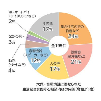 令和3年度に大気・音環境課に寄せられた生活騒音に関する相談は195件ありました。